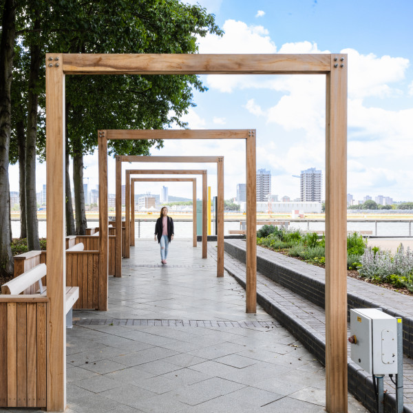 As part of the plan, the campus entrances incorporated external graphics to increase brand visibility and recognition, whilst the outdoor spaces utilised playful and practical features such as creative public seating, bike storage, movable plants, exhibition displays, lighting, and large-scale environmental graphics. Outdoor spaces incorporated playful and practical features such as tiered public seating (using The Forest Stewardship Council (FSC) sourced Iroko hardwood and recycled steel), landscaping, exhibition displays, lighting, and pop-up spaces.