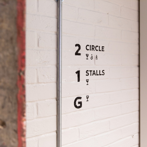 So, our central design concept for the main navigational signage grew out of the idea of ‘ghost signs’ – signs from the past directly hand-painted onto the building. The ‘ghost signs’ idea tied in with the overarching concept of ‘peeling back the past’ to expose the history of the building whilst refurbishing it for modern audiences to move more easily between the front of house spaces and into the auditorium.