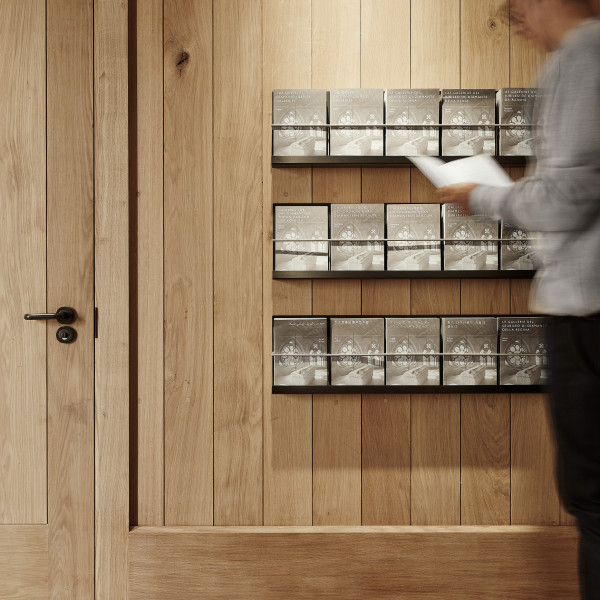 To avoid damaging the ancient woodwork, we attached the label signs to french polished oak blocks, which were securely inserted into any available gaps. This way the overall look remained consistent – and allowed for expansion without damaging the original oak.