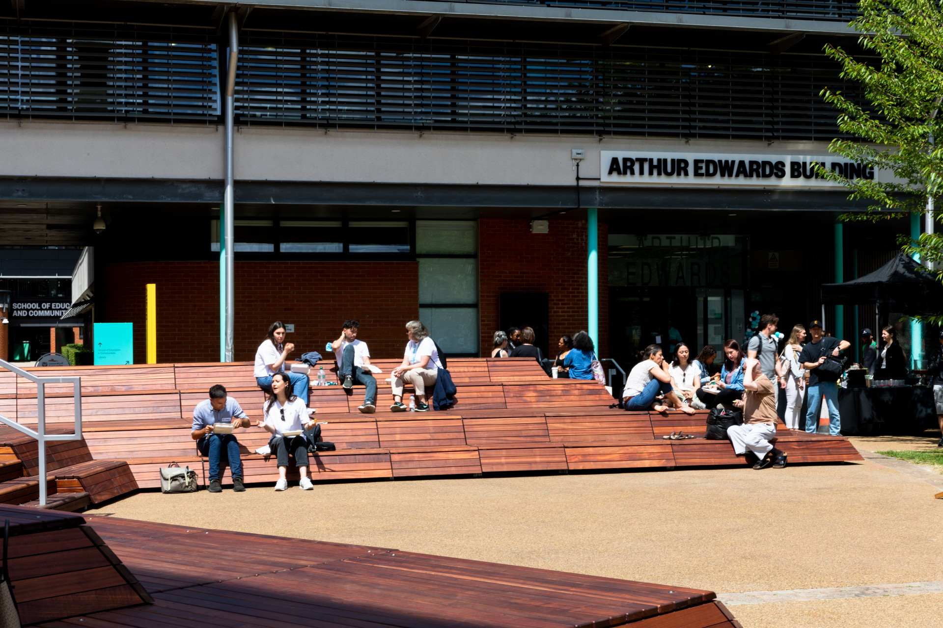 As part of the plan, the campus entrances incorporated external graphics to increase brand visibility and recognition, whilst the outdoor spaces utilised playful and practical features such as creative public seating, bike storage, movable plants, exhibition displays, lighting, and large-scale environmental graphics. Outdoor spaces incorporated playful and practical features such as tiered public seating (using The Forest Stewardship Council (FSC) sourced Iroko hardwood and recycled steel), landscaping, exhibition displays, lighting, and pop-up spaces.