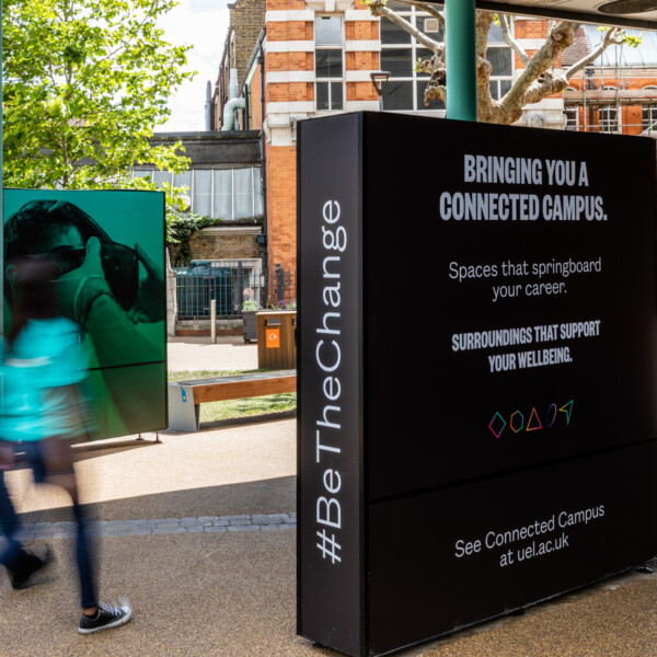 In 2023, UEL celebrated its 125th anniversary by transforming its Docklands campus into a vibrant, landscaped well-being garden featuring activity trails. Bold storytelling elements now adorn hoardings, walls, and exhibitions across the campus. Additionally, a hybrid wayfinding system, integrating both static and digital signage, has been introduced to ensure flexibility for future navigation needs.